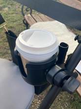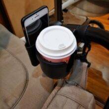 This stroller cup holder isn't just for strollers, but for anything that has a bar or pole. Because the loop can be loosened it will generally fit on any device 2 inches or smaller. It is easy to put on and is a large enough cup holder to fit a larger cup than usual. The phone slot is a great addition as wel