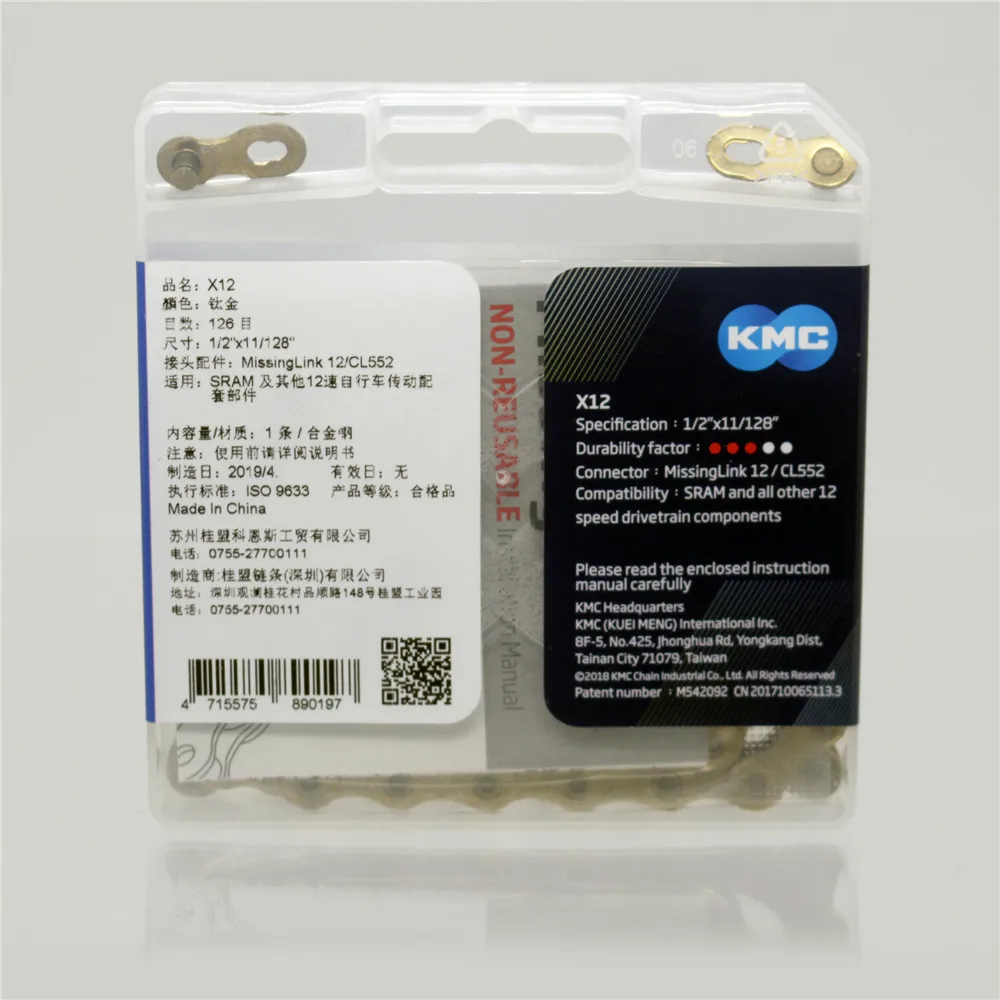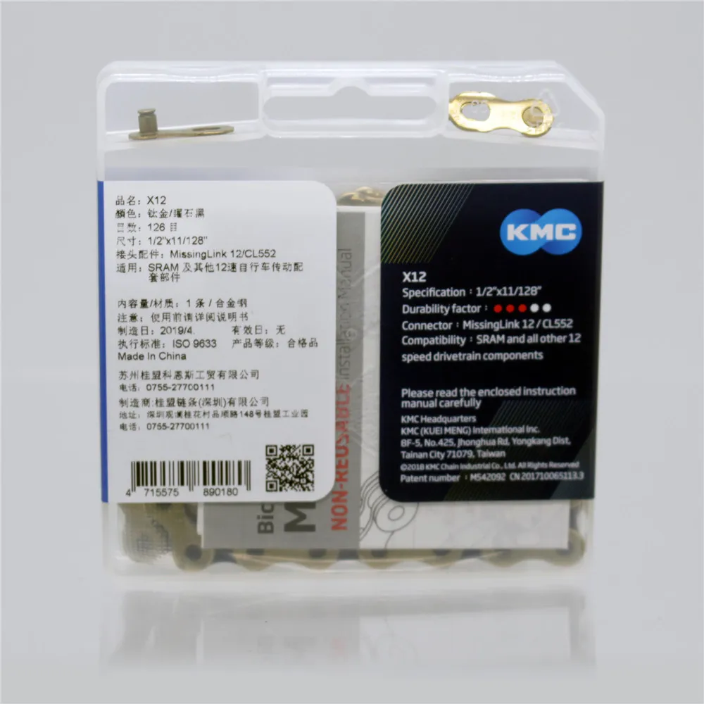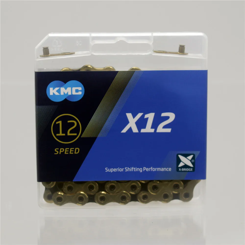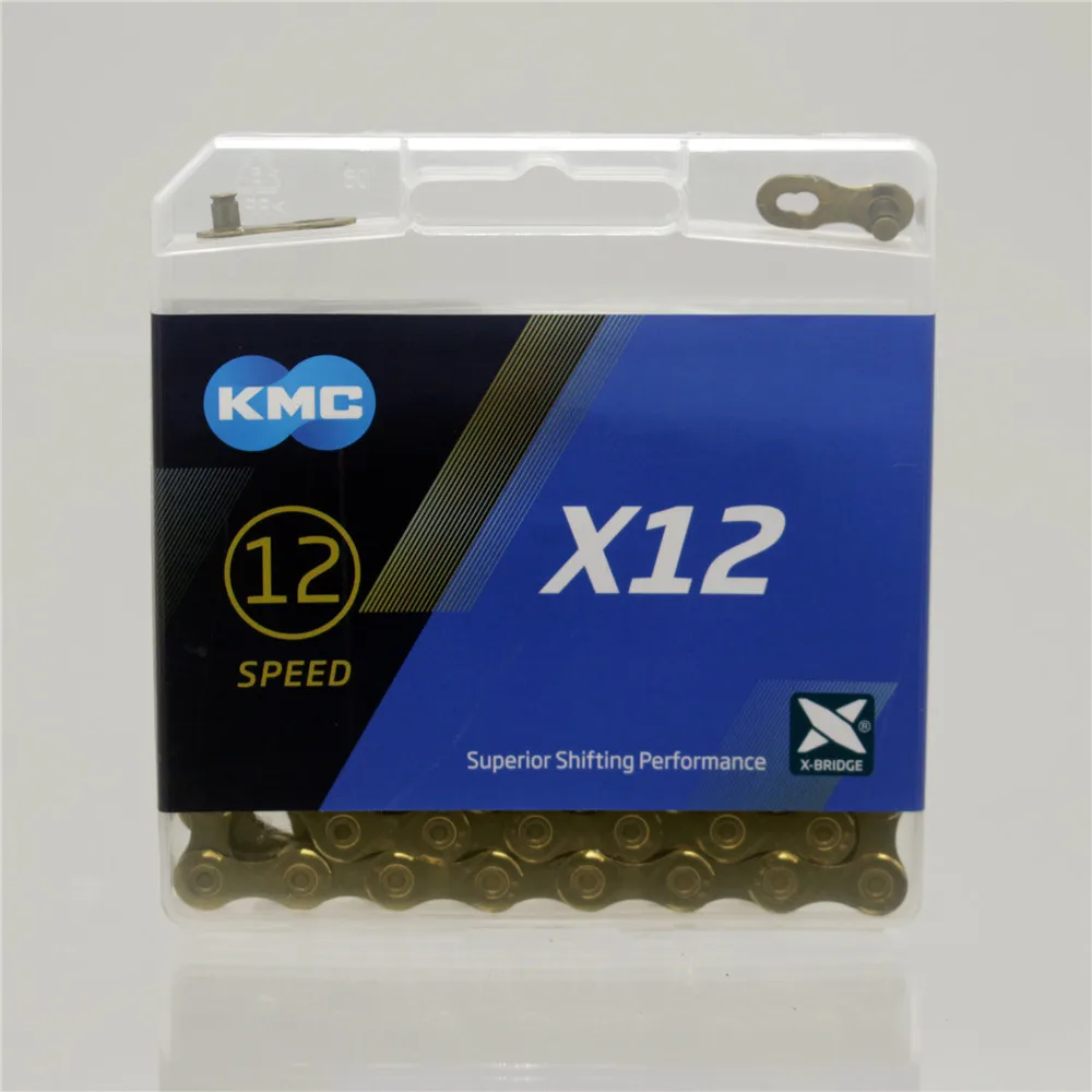 The KMC X12 Ti-N Gold is gold in color, includes a missinglink connector, and is compatible with SRAM and Campagnolo 12-speed drivetrains.