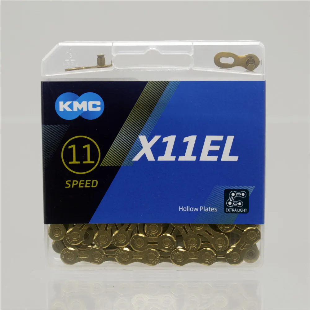 The super light X11SL Ti-N 11-speed chain from KMC without directional dependency and an Titanium Nitride Gold surface coating for 11-speed derailleur systems.