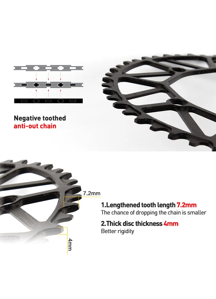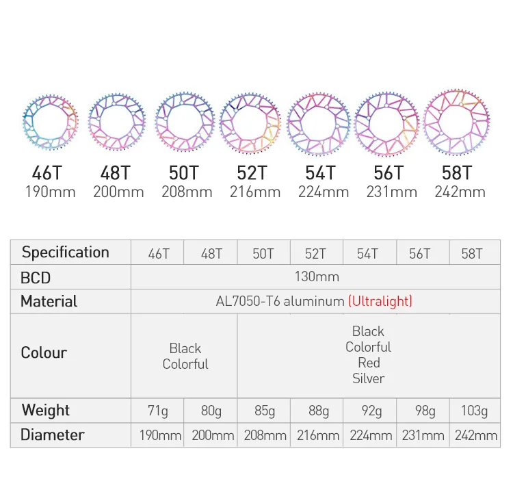 Very fast shipping and very good packaging. The chainring fits very well. The aluminium is very strong and the finish is without mistakes. The narrow wide profile is cnc cutted and looks great. The weight is 73 gramm. Thanks.
