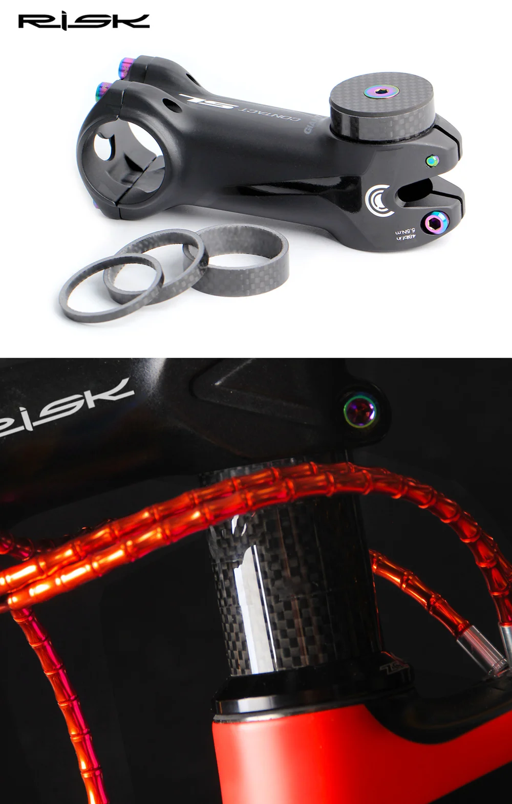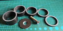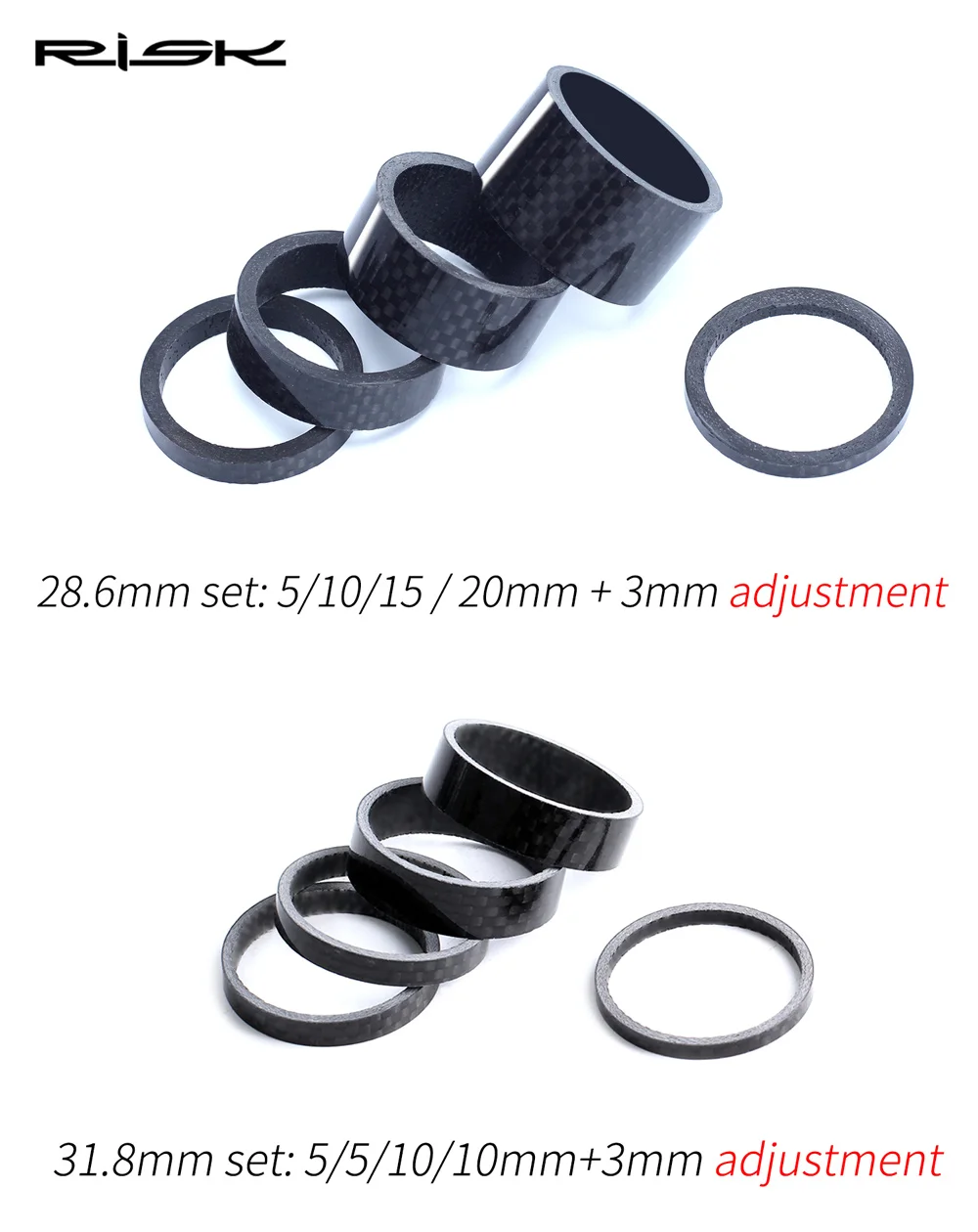 Delivery much faster (13 days) than the deadline announced during my order (36 days) good surprise and congratulations! Beautiful carbon finish with a glossy varnished appearance making the braiding of the carbon fiber stand out. 5 different heights of rings in 3-5-10-15-25mm in order to be able to bearing all desired mounting configurations. Attention on the other hand with a large thickness of carbon and an outer diameter of the rings of 35mm, which with some light stems in rather thin aluminum can have a medium aesthetic appearance. For my part, it suits me perfectly.