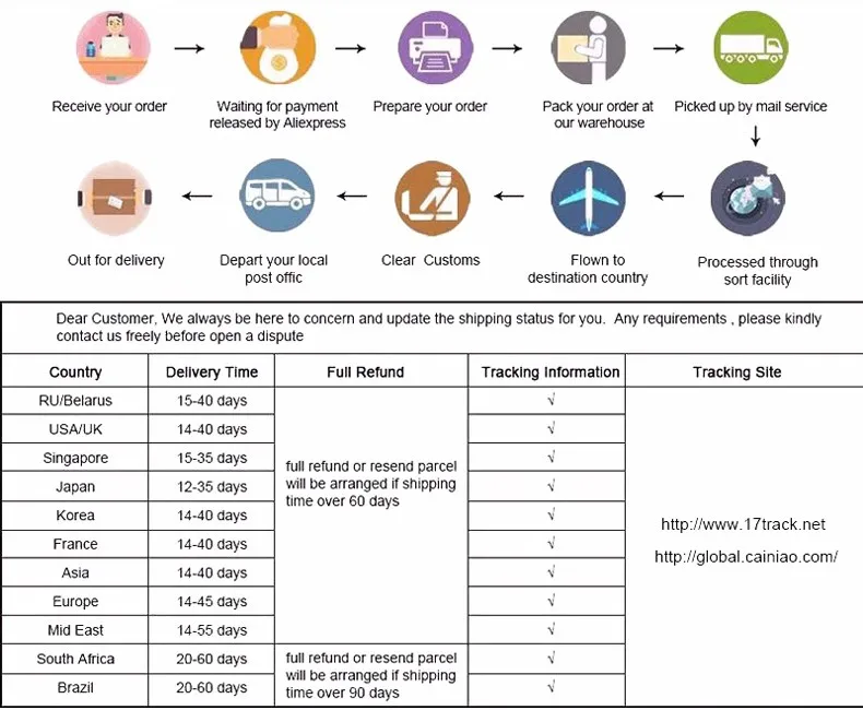 - If you did not receive the product within the guaranteed time( 45 days not including 2-5 day processing) you can request a refund or a reshipment.