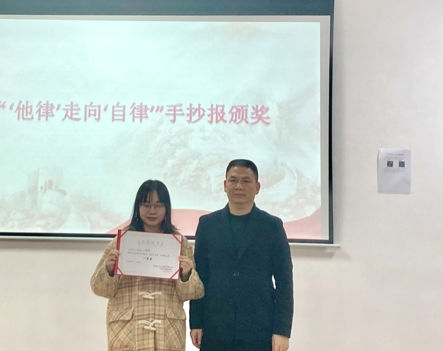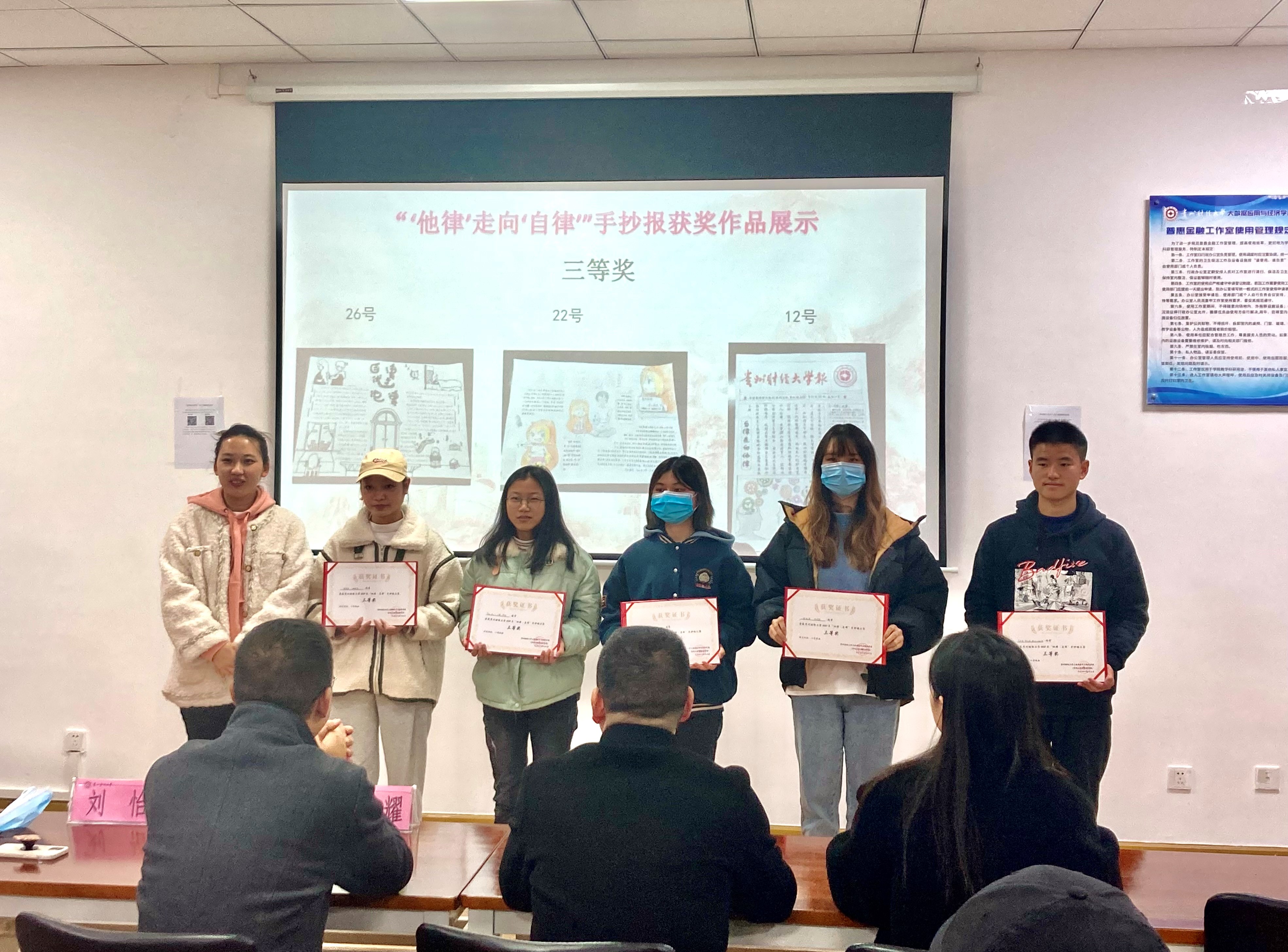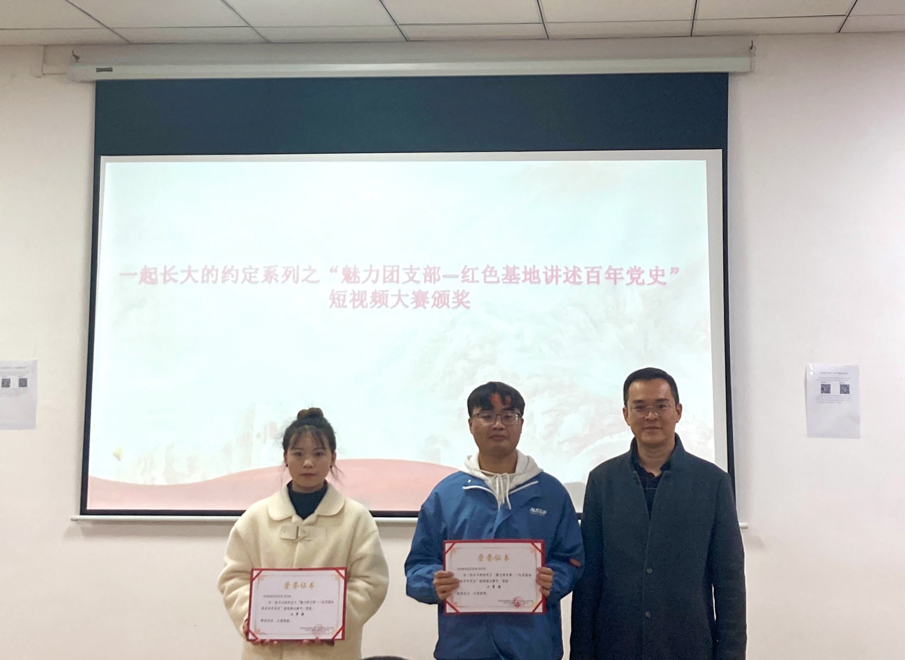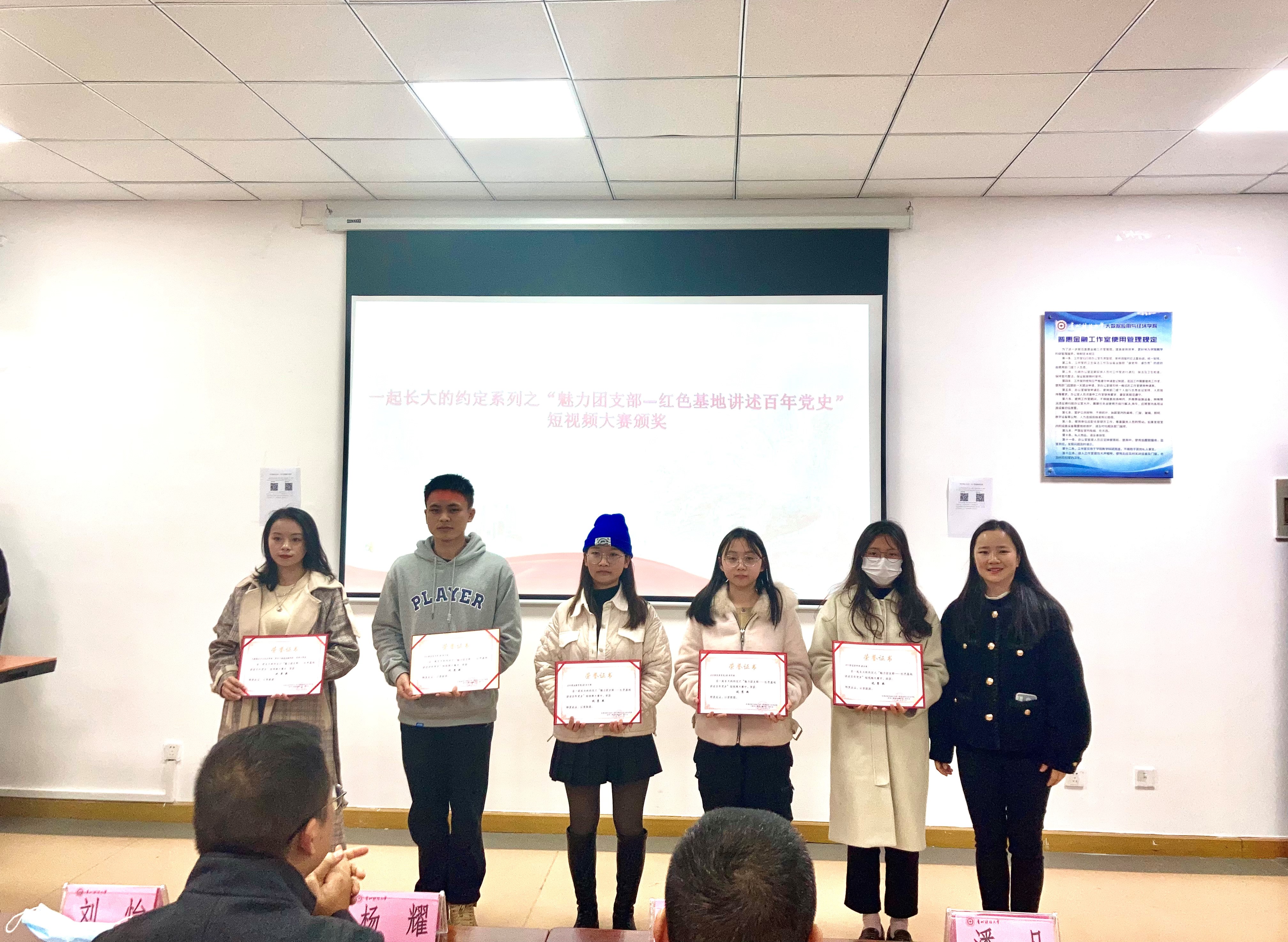 随后,由姜友文、杨耀、刘怡、潘凡为一起长大的约定系列之“魅力团支部—红色基地讲述百年党史”短视频大赛及“他律走向自律”手抄报获奖者颁奖。最后,全体与会人员合影留念。