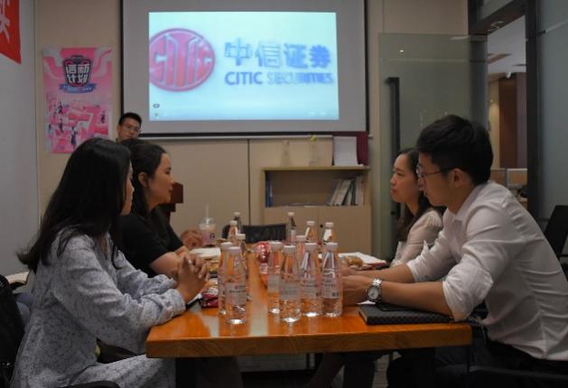 首先,调研成员参观了公司内部的客户接待区、员工办公区、会议室等场所。座谈会上,财富配置专员高文念通过公司宣传视频向大家介绍了中信证券的行业发展情况,并围绕企业的日常运作、业务程序、客户群体的投资需求、企业运营模式及相关业务程序环节等方面对同学们进行系统地阐述。