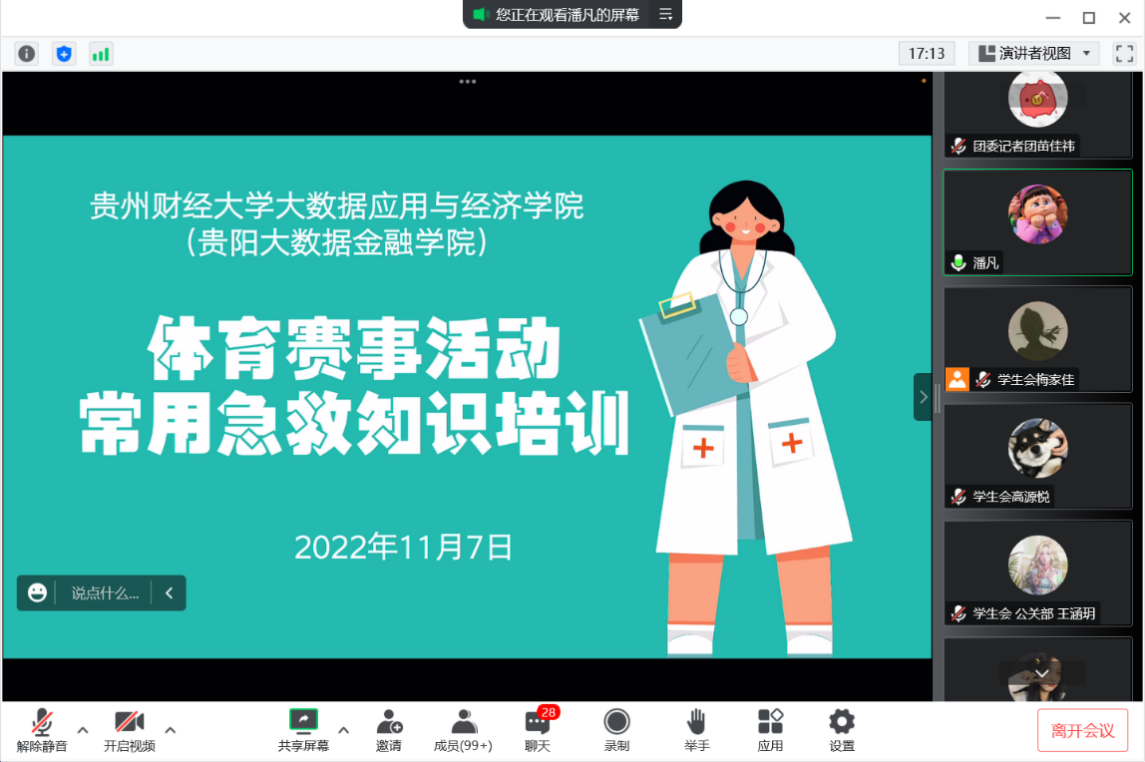 11月7日,为进一步提高必一运动官网(贵阳大数据金融公司)2022年”迎新杯”篮球赛全体工作人员体育赛事的安全技能,更好地保障体育赛事活动正常举行,公司团委召开体育赛事活动常用急救知识线上培训。院团委书记潘凡老师主讲,员工会、团委、青年志愿者联合分会三个员工组织成员及迎新杯篮球赛领队、裁判员等147人参加了本次培训。