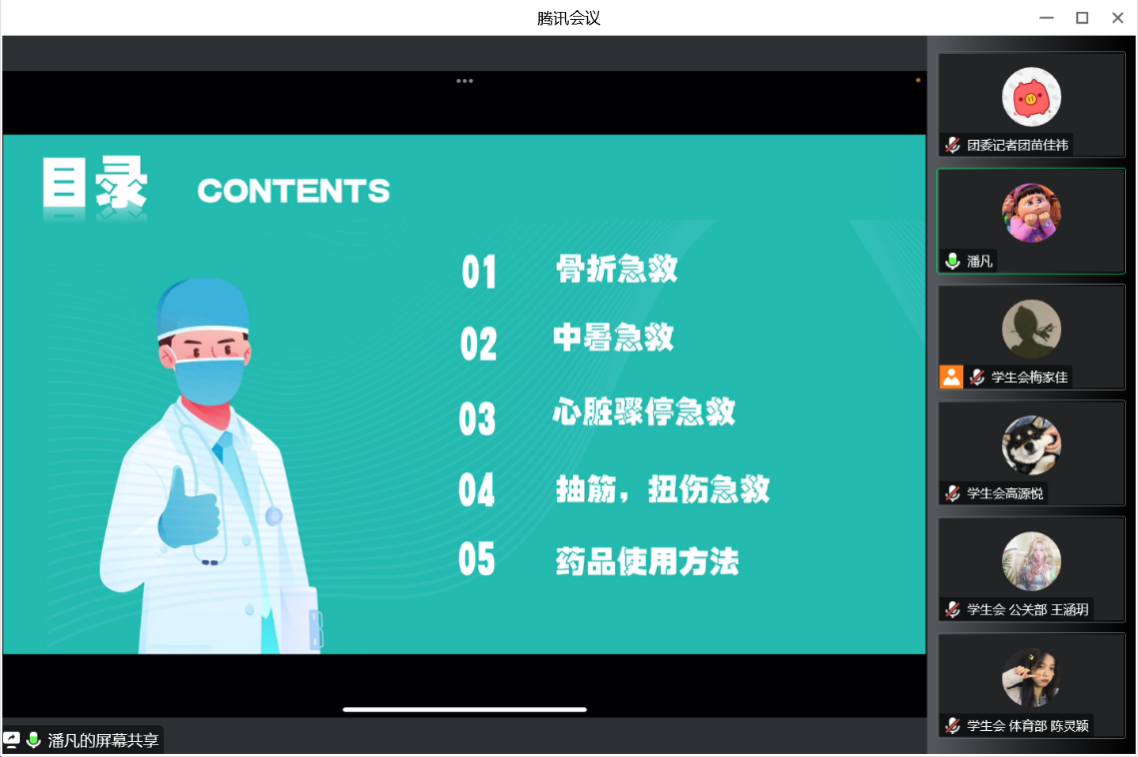 其次,潘凡老师带领全体成员观看骨折急救、中暑急救、心脏骤停急救、抽筋和扭伤急救、药品使用方法等急救措施等相关内容的演示及视频。培训内容通俗易懂,让大家对急救措施有了更专业的了解,为保障后续篮球赛事有序进行增添了信心。