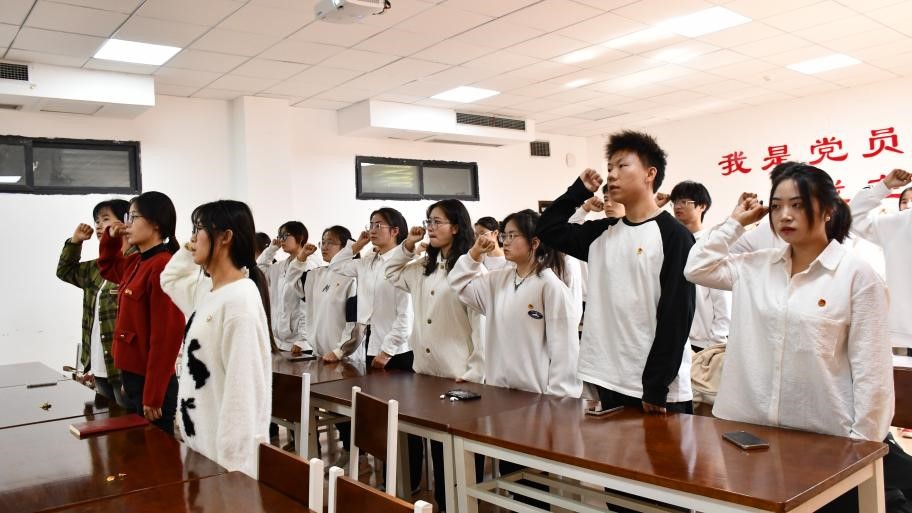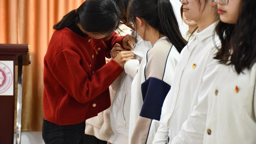 在庄严又嘹亮的国歌声中,入团仪式拉开了帷幕,主持人宣读了新团员名单。潘凡老师,员工团干赵单、许远秀、刘仪慧为新团员佩戴团徽,潘凡老师带领全体与会人员、新团员们宣读入团誓词,声音洪亮激昂,充分展现了新团员们立志严守团的纪律,勤奋学习,积极工作,吃苦在前享受在后,为共产主义事业而奋斗的坚定信念!
