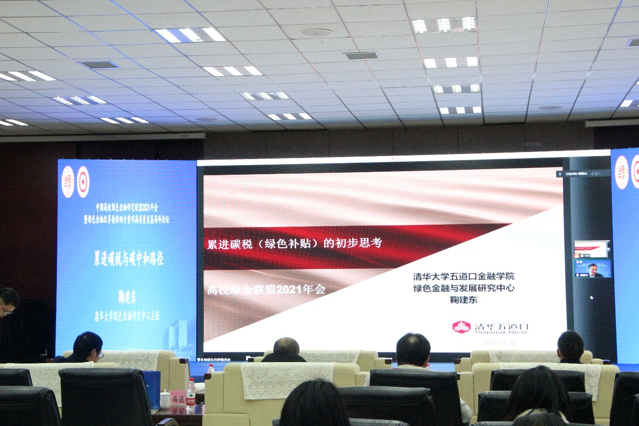 清华大学绿色金融研究中心主任鞠建东以“累进碳税与碳中和路径”为主题,以气候变化会带来的金融风险为切入点,引出了气候风险的重要性、气候风险的资本定价、气候风险的折现、变革的有效手段以及目前碳市场困境等五个问题的讨论,并结合碳税理论以及单一碳税的模型分析结果,提出累进碳税的方法,建议可推进中性的产业政策。