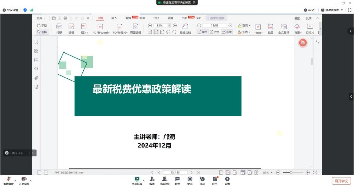 2024125日晚,公司邀请贵州世邦税务师事务所法定代表人、税务专硕校外硕导、省级产业导师邝湧为税务硕士研究生作题为“最新税费优惠政策解读”的线上主题讲座。讲座由必一运动官网税务专硕硕导组组长黄江玉副教授主持,共计60余名师生聆听了讲座。讲座主要围绕一系列最新税费优惠政策及案例分析展开。首先,邝湧老师介绍了小型微利企业优惠、六税两费优惠等政策的具体内容,结合文件详细阐述了各项政策规定的判定标准、注意事项及部分政策实施的时间节点。其次,他针对不同的优惠政策,结合具体的案例逐一进行分析,从而帮助在座的师生更好地理解这些政策的实际应用,这对于同学们在实务方面的学习具有重要的指导性。最后,邝湧老师针对综合优惠政策的内容进行了解读,拓展了同学们在税费优惠政策方面的知识。讲座结束后,邝湧老师与参会师生们进行互动讨论,针对同学们提出的不同问题具体分析,让同学们更好的融会贯通本次讲座内容。