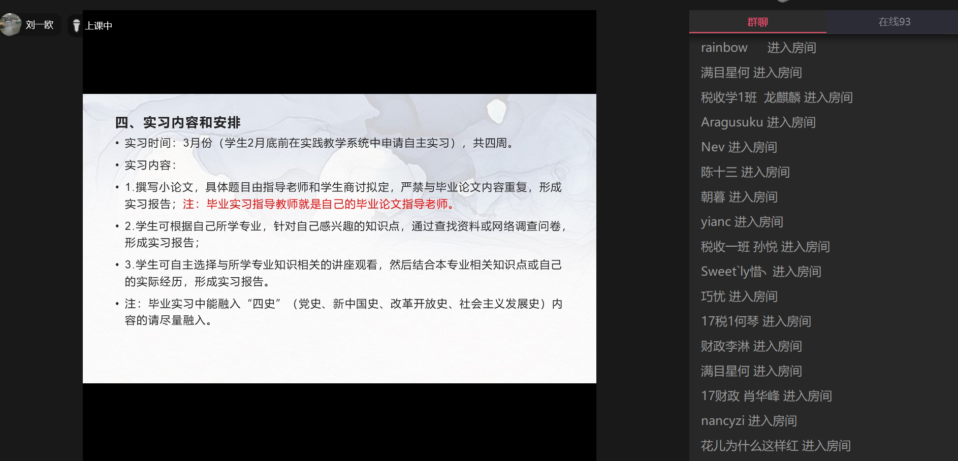 为了提高公司财税系同学的毕业实习工作进展效率,帮助2017级财税系同学能进一步了解实习期间所需要注意的各项内容事宜。1月6日晚上7点,公司财税系副主任刘一欧、魏彧通过腾讯视频会议,线上为2017级财政学和税收学两个专业的同学做了毕业实习动员。财政学和税收学专业的全体同学参加了此次毕业实习动员大会。