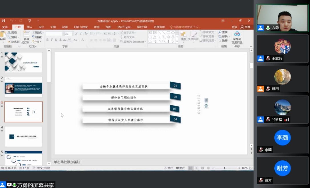 其后,方勇以《金融专业职业透视与发展》为主题,从金融专业就业选择及行业发展现状、金融机构热门职位介绍、各类银行就业优劣势对比和银行从业人员就业晋升路径等方面,详细介绍当前金融专业研究生的就业情况和发展前景,为金融专业研究生就业选择指明了方向,并鼓励同学们应充分利用假期参加实习或者实践活动积累社会经验。本次讲座内容丰富多彩,讲解生动易懂,得到了老师和同学们的一致好评。