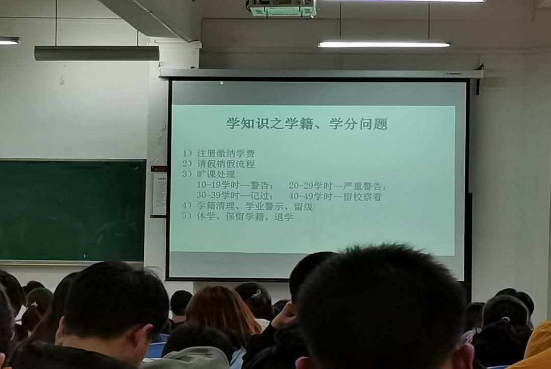 针对大家关心的学知识之学籍、学分问题,辅导员张老师耐心的向我们做了分析和指导。张老师从学籍、请销假流程、综测、培养方案、专业分流等方面为大家做了详细的介绍,同时张老师还就大家的老员工涯规划为大家做了简要介绍,让同学们更清楚地认识到自己大学期间的努力方向,为我们指明了学习的重点。
