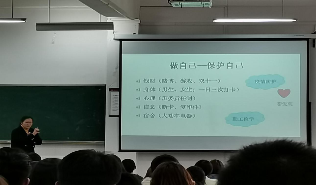 张老师提醒同学们最重要的是保护好人身安全。遇到问题及时沟通,寻求同学和老师的帮助,同时自己要多加注意。张老师还特别强调女同学要保护好自己,尽量结伴而行。并且在疫情期间做好预防工作,在宿舍不要使用大功率电器,坚持每天打卡。