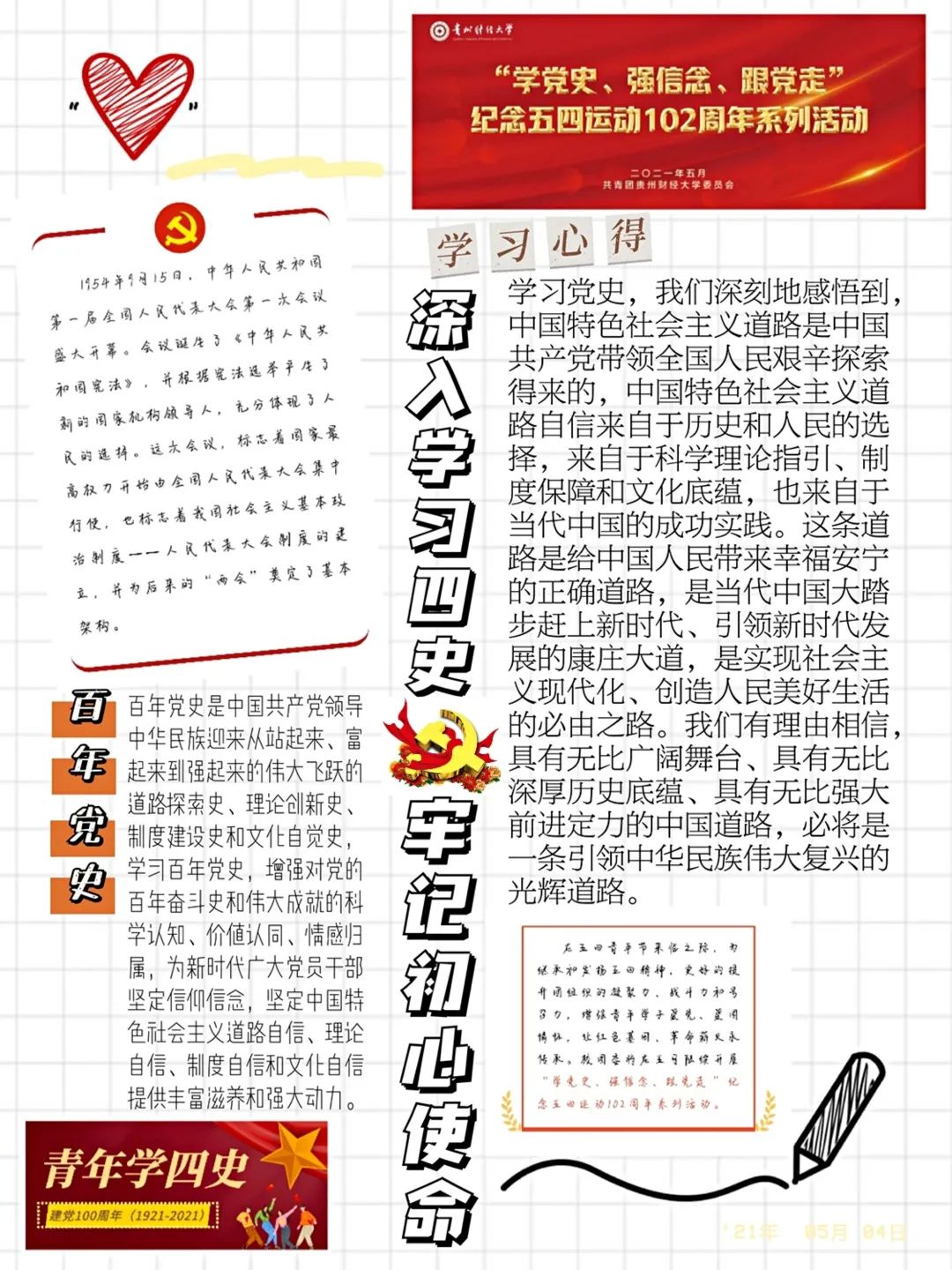 公司组织全校师生开展网上重走学习教育长征路,以及开展“四史”学习教育竞答活动,并在4月24日下午14:00组织师生于人民网观看“同上‘四史’思政大课”。与此同时,公司于4月25日下午在普惠金融工作室举办“学好‘四史’,牢记初心使命”主题知识竞赛决赛,更好地学习贯彻了“四史”精神。相关活动的开展拓展了师生学习“四史”的途径,也丰富了学习“四史”的形式。本月同学们继续坚持采用手绘、贴纸、照片、手抄等方式制作“青春手帐”,记录下学习“四史”的心得与感悟,表达自己对“四史”精神的理解和学习“四史”的坚定决心。