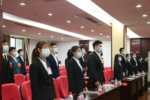 在持人依次介绍各位领导及老师后,全体人员起立奏唱国歌。员工代表大会在庄严的国歌声中正式拉开序幕。