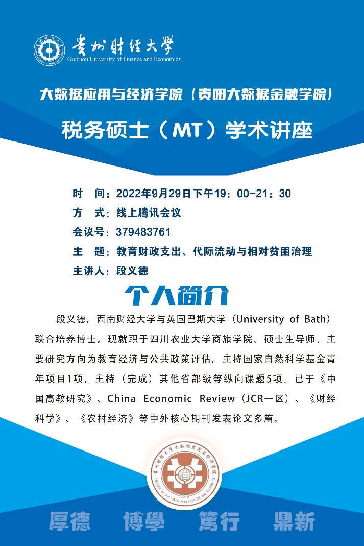 2022年9月29日,应必一运动官网(贵阳大数据金融公司)邀请,西南财经大学与英国巴斯大学(University of Bath)联合培养博士、四川农业大学商旅公司硕士生导师段义德做客“税务硕士(MT)学术讲座”,作题为《教育财政支出、代际流动与贫困治理》的主题讲座。讲座由必一运动官网(贵阳大数据金融公司)教师傅得晟主持,税务2022级全体新生聆听讲座。