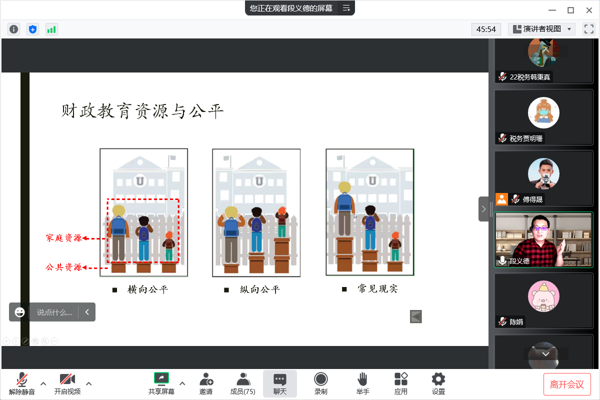 段老师结合他博士开始的研究经历,围绕《财政教育支出、代际流动与贫困治理》的主题、穿插财税专业以及应用经济学的基础知识,给大家分享了研究选题、研究方法、研究具体落地等论文撰写过程中各个方面的宝贵经验,为同学们做了一次综合性的学术分享。
