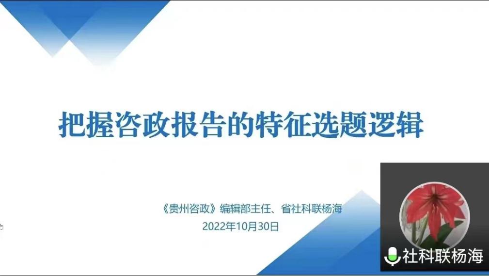 杨海主任围绕在二十大召开结束后,如何加强应用咨政报告的特征逻辑展开讲解,主要从三个方面进行了讲述,即咨政报告的鲜明特征、咨政报告的研究选题、咨政报告的基本逻辑。首先,杨主任对咨政报告鲜明特征做了具体的阐述,强调要有针对性、导向性、操作性、时效性、规范性几个特点;其次,他提出对咨政报告的研究选题要求要有深刻认识,提高咨政“含金量”和建言“靶向性”,关键是要做到选题“精准”;再次,提出把握咨政报告基础逻辑的关键,要做到深入调查研究,看问题要有高度,分析问题要有深度,要找准角度。最后,杨主任为大家讲解了今年选题的重点方向。