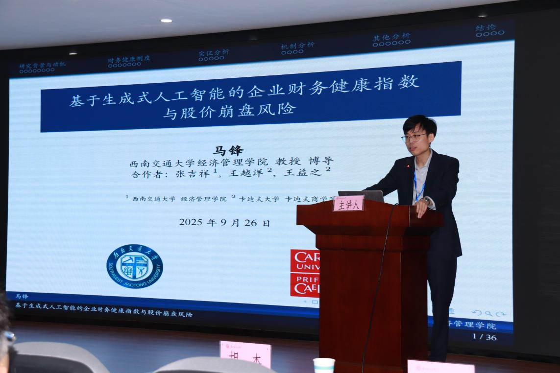 马峰教授在论坛上作了题为《基于生成式人工智能的企业财务健康指数与股价崩盘风险》的报告。他提到,生成式人工智能正深刻影响金融领域,能捕捉报表多模态风险、解决特征异质问题、提前识别不健康企业,还探讨了股价崩盘风险的成因。马峰教授的报告兼具理论深度与数据案例支撑,内容精彩实用,赢得现场阵阵掌声。
