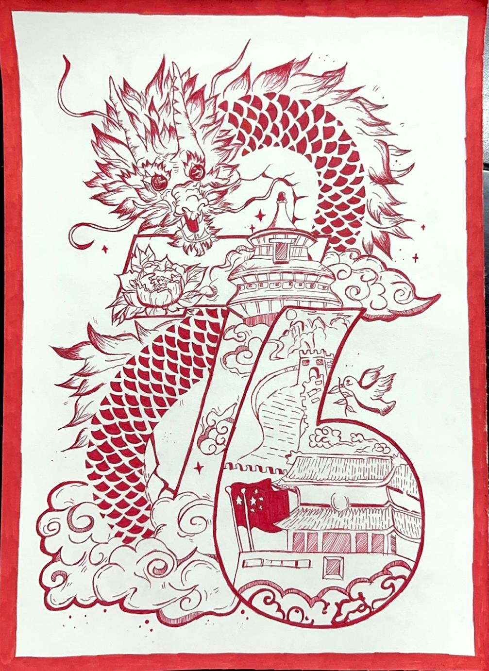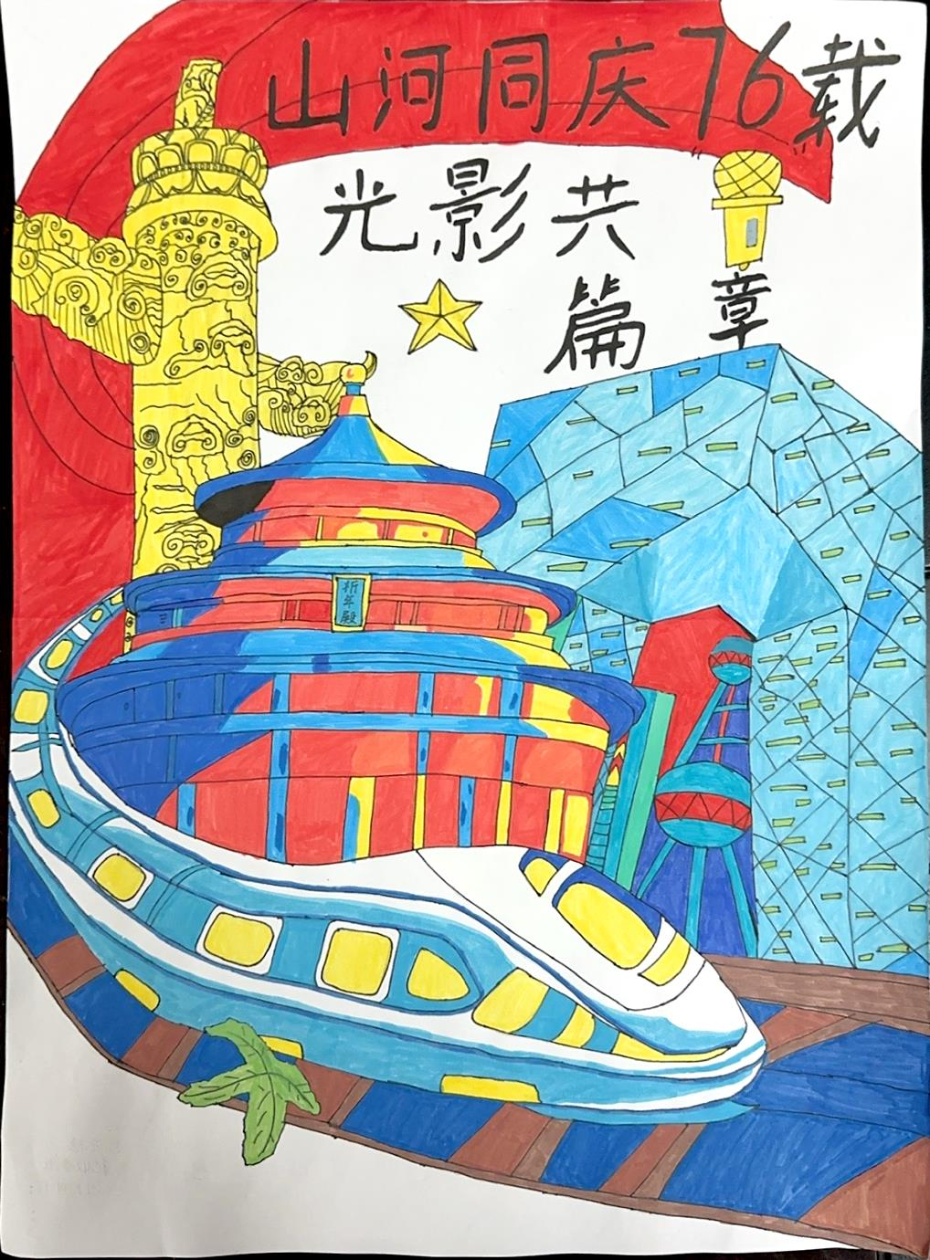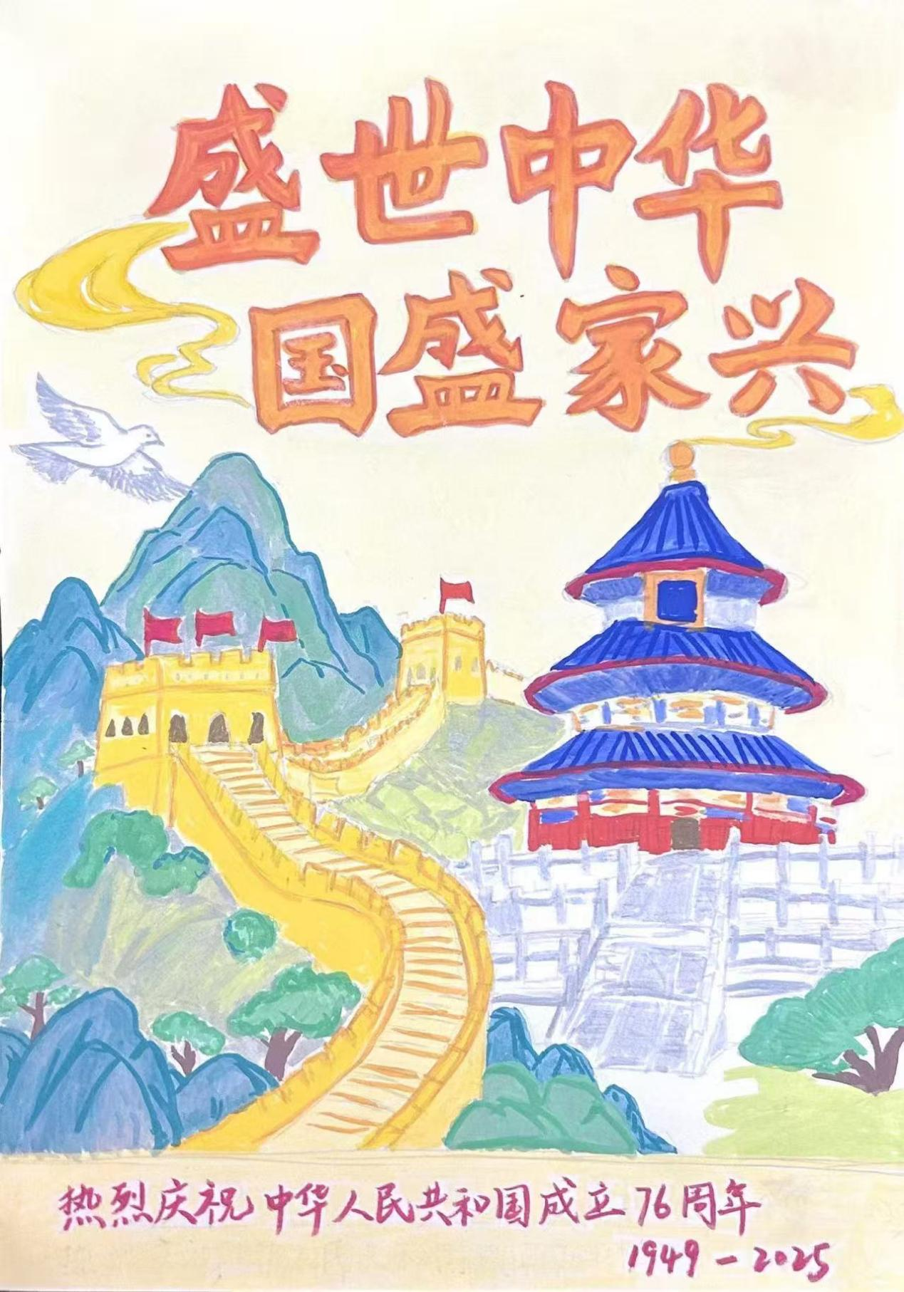 手绘作品同样精彩,同学们以笔为媒,以心为愿,勾勒出对祖国的美好祝福。