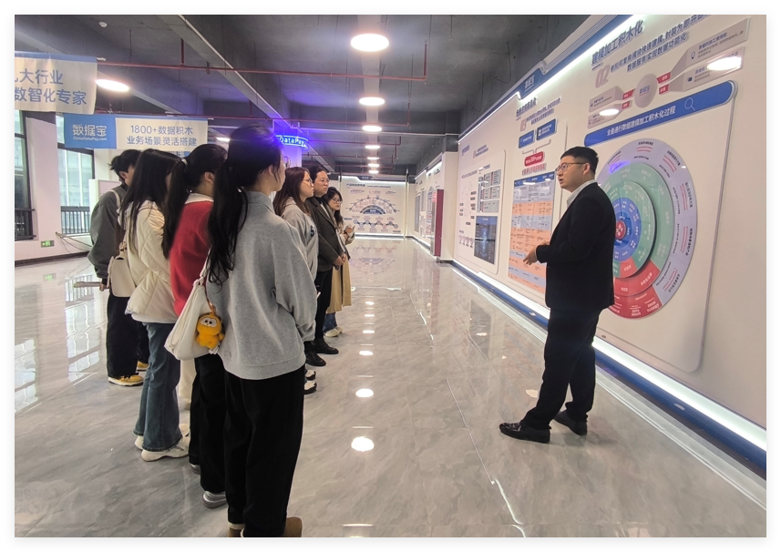 活动伊始,公司负责数据资产业务线的铁金堂经理带领师生参观公司业务展示区,详细介绍公司发展历程、主营业务布局、数据要素服务、政企数据流通与应用、技术研发能力、市场服务案例及行业发展前景,重点介绍了公司在数据治理、数据服务、数字经济应用等领域的核心优势。通过参观学习,大家对数据要素流通行业发展现状、企业运营模式与人才标准有了更加直观深入的了解。
