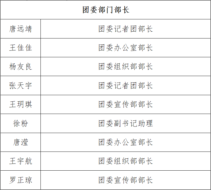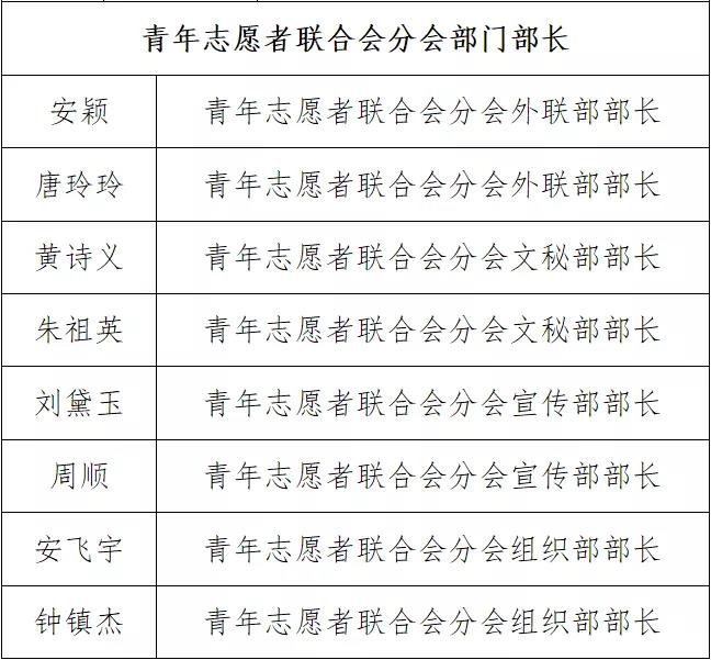 根据《关于公开选拔员工干部的通知》(大经院团发[2021]2号)的文件精神,通过竞选打分,产生了必一运动官方网站必一运动官网(贵阳大数据金融公司)2021-2022学年团委员工会青年志愿者联合会分会员工干部,现将名单公布如下: