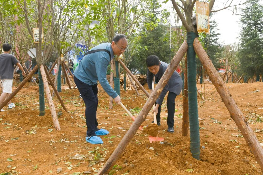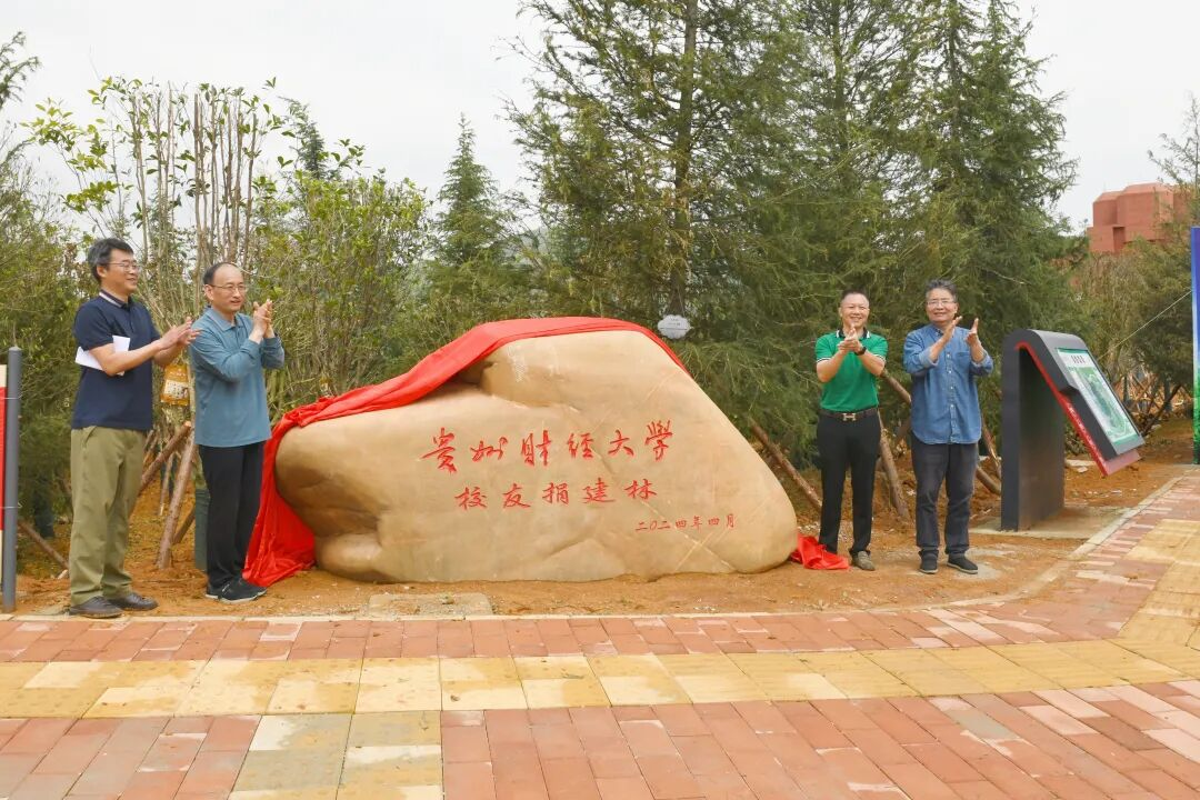 张晓阳、杨勇、刘元贵、李天柱共同为“员工捐建林”揭幕。师生、员工们一起走进员工林,挥锹铲土,培土围堰,悬挂铭牌。一棵又一棵员工树凝结着大家感恩于心、铭志于树、寄情于林的爱校、奉献情怀;一块又一块员工铭牌,既展现了项目捐赠信息,也表达了母校对捐赠方的尊敬与敬意。